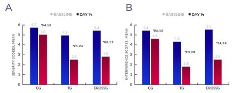 Figure 1: Baseline and day 14 overall mean (A) severity and (B) interference scores within the control, treatment, and crossover groups. *95% Confidence Interval of the difference, paired t-test. Each difference is statistically significant. Abbreviations: CG, control group; TG, treatment group; CROSSG, crossover group.