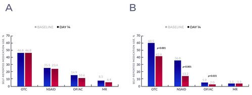 - There was no change in OTC pain medication within the CG; the 22 patients who reported use at baseline also reported use at day 14 (see Figure 2A).