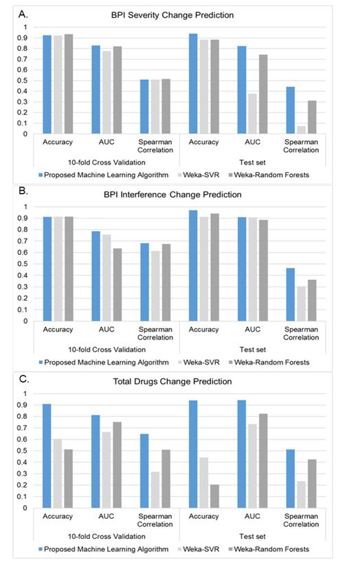 Data were split into training (n=152) and testing (n=34) patient sets in a stratified manner. Three basic endpoints were examined for the prediction models: total BPI Severity scores, total BPI Interference scores, and changes in the total drugs.
