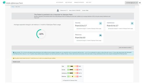 Screenshot of web tool for personalizing the application of Salonpas® Patch using the trained machine learning models. After the data of the patient are being stored, the predicted decrease of BPI Severity, BPI Interference and Total Number of Drugs after using Salonpas® Patch are displayed to allow a more informed decision about its suitability with the patient’s profile