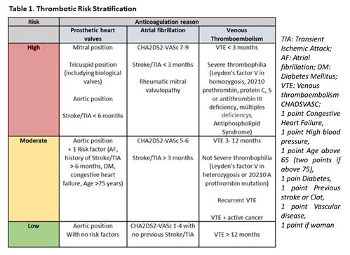 Patients with oral anticoagulation therapy (OAT) with vitamin K antagonists (VKA) undergo invasive procedures. Deciding wether to withdraw or maintain the OAT, as well as the needing to implement low molecular weight heparin (LMWH) as bridge therapy (BT), will be determined by the patient's thrombotic risk (TR) and surgery’s haemorrhagic risk (HR).