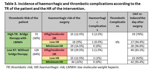 Interventions and clinical events during the follow-up are shown in Table 2.Eleven post-surgical haemorrhagicevents (5,5%) are described[GJ1] . Three (two hemoperitoneumand one haematomaof anterior rectus abdominis muscle) required hospitalisationfor management, being solved with conservative treatment. Eight were mild events, handled outpatiently. No thrombotic events were recorded. Generally, OAT was re-induced the day after surgery in patients undergoing minimal and low HR interventions, being the percentage lower in patients undergoing high HR interventions