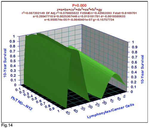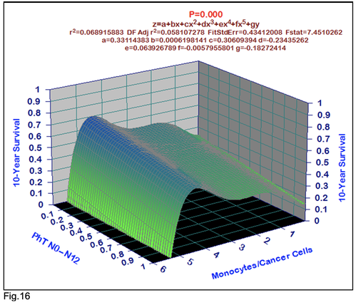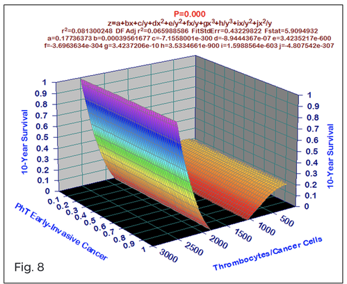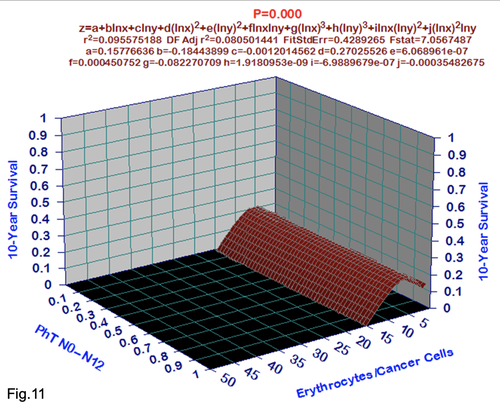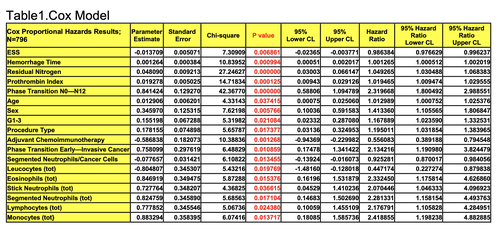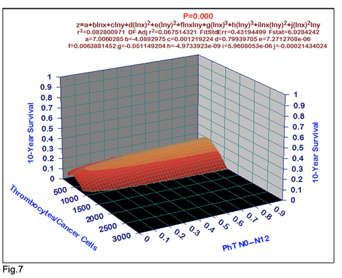 All clinicopathologic characteristics and treatment modalities were evaluated in traditional Cox multivariate prognostic factor analysis. In accordance with Cox regression model, the 17 variables significantly explained GCP 10-year survival with N0-2 (n=796) after complete gastrectomies: Cox modeling displayed that 10YS of GCP significantly depended on: phase transition (PT) early-invasive GC in terms of synergetics, PT N0—N12, cell ratio factors (ratio between cancer cells- CC and blood cells subpopulations), G1-3, AT, blood cell circuit, prothrombin index, hemorrhage time, residual nitrogen, age, sex, procedure type (P=0.000-0.039)(Table 1).