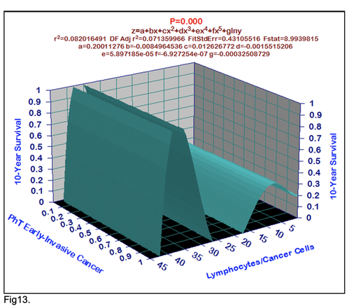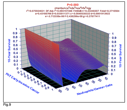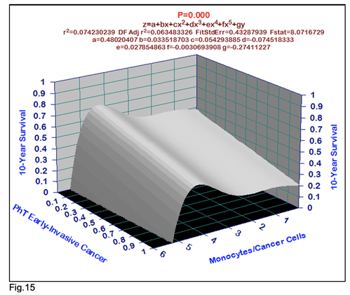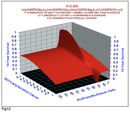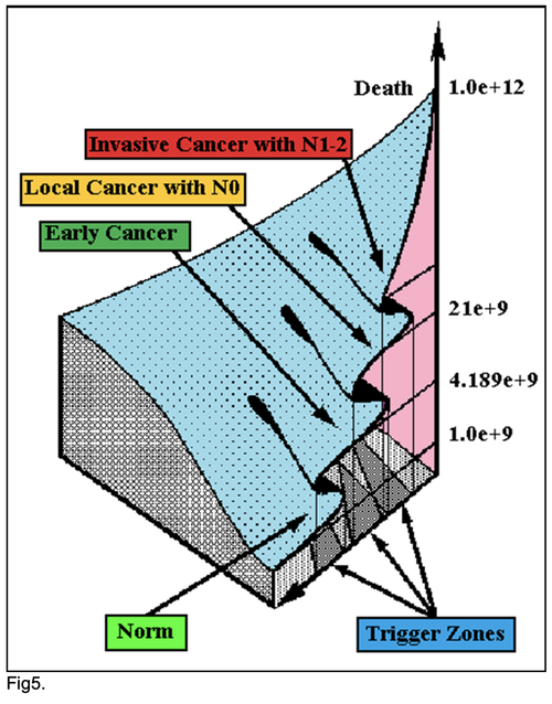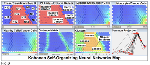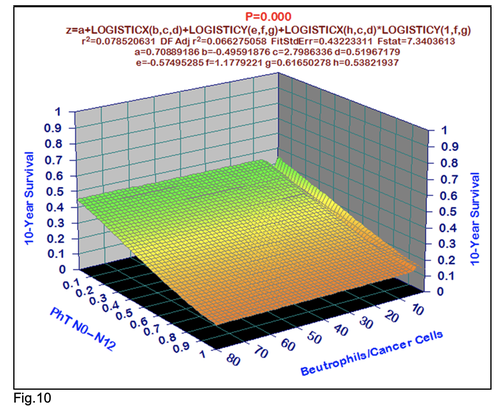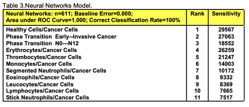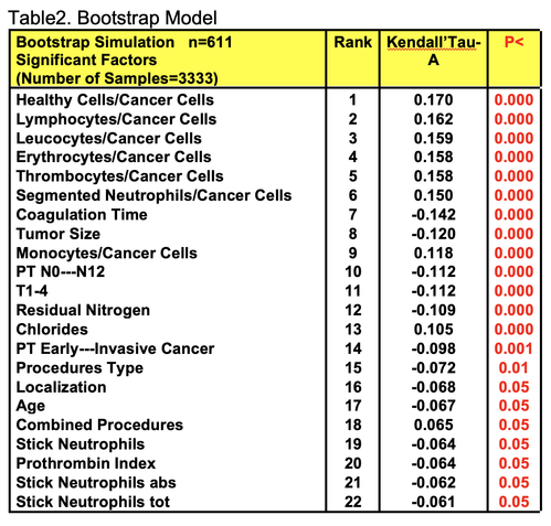 For comparative purposes, clinicopathological factors of GCP (n=611) were tested by neural networks computing (4-layer perceptron) (Table 3). Obviously, analyzed data provide significant information about GC prediction. High accuracy of classification (10-year survivors vs. losses) was achieved 100% (baseline error=0.000, area under ROC curve=1.0). In other words, it remains formally possible that at least 11 of these factors might predate neoplastic generalization: Healthy Cells/CC (rank=1), PT early---invasive GC (rank=2); PT N0---N12 (Rank=3); Erythrocytes/CC (4); Thrombocytes/CC (5); Monocytes/CC (6); Segmented Neutrophils (7); Eosinophils/CC (8); Leucocytes/CC (9); Lymphocytes/CC (10) Stick Neutrophils (11). Moreover, bootstrap simulation confirmed the paramount value of Cell Ratio Factors, PT N0---N12 and PT early---Invasive GC (Table 2). It is necessary to note a very important law: both transitions of the early cancer into the invasive cancer, as well as the cancer with N0 into the cancer with N1-N2, have the phase