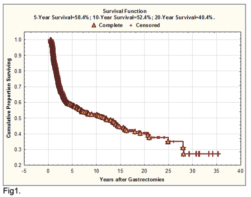 For the entire sample of 796 patients overall life span (mean±standard error) was 2130.8±2304.3 days (95% CI, 21196.4-2423.5; median=1089.5) and cumulative 5-year survival reached 58.4%, 10-year survival – 52.4%, 20-year survival – 40.4% (Fig.1). 316 GCP (life span=4316.1±2292.9 days) lived more than 5 years and 169 (life span=5919.5±2020 days) – more than 10 years without any features of GC progressing. 294 GCP (life span=640.6±347.1 days) died due to the cancer generalization within the first 5 years after complete gastrectomies.