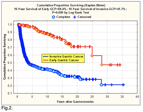 It is necessary to pay attention on the two very important prognostic phenomenons. First, 88.4 % 10-year survival for GCP with the early cancer as against 41.7% for the others GCP after gastrectomies (P=0.000 by log-rank test) (Fig.2). We understand as the early cancer the tumor up to 2 cm in diameter, witch invades submucosa without lymph node and distant metastases [10].