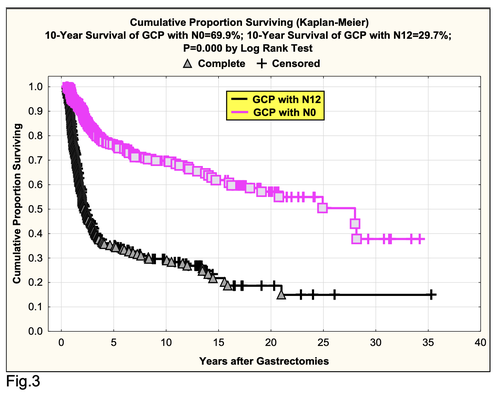 Second, good 10-year survival for GCP with N0 (69.9%) as compared with GCP with N1-2 (10-year survival was 29.7%) after radical procedures (P=0.000 by log-rank test) (Fig.3).