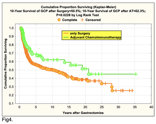 For the 173 GCP in adjuvant chemoimmunotherapy (AT) arm (group A) cumulative 10-year survival reached 62.3% vs. 50.5% (group B) (P=0.0228 by log-rank test) (Fig.4).