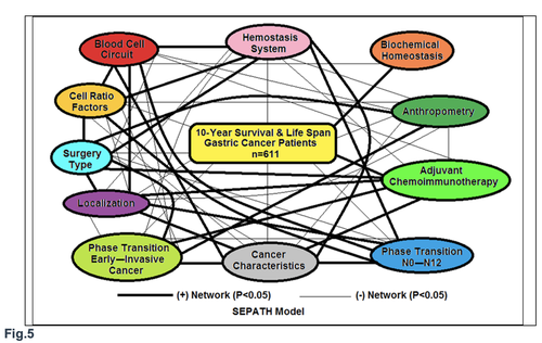All of these differences and discrepancies were further investigated by structural equation modeling (SEPATH) as well as Monte Carlo simulation. For more exact analysis 185 patients were excluded from sample, which were alive less than 5 years after complete gastrectomies without relapse. From data, summarized in Fig. 5 it was revealed that the ten clusters significantly predicted 10-year survival and life span of GCP with N0-2 status (n=611): 1) PT early--invasive GC 2)PT N0—N12; 3) Cell Ratio Factors; 4)GC characteristics; 5) biochemical homeostasis; 6) hemostasis system; 7) surgery type; 8) adjuvant chemoimmunotherapy; 9) anthropometric data; 10) tumor localization.
