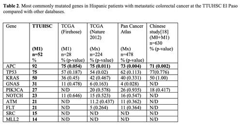 Interestingly, the overall incidence of CRC among the Hispanic population has been declining over the last decades. Recently, however, adramatic increase inCRC incidentswas reported among Hispanics younger than 50 years of age (early-onset CRC). The increase in the incidence of early-onset CRC was markedly more significantin Hispanics (45%) than in non-Hispanic Whites (NHW) (27%) and African Americans (AA) (15%). Also,in contrast to NHW, Hispanics have a worse survival rate. The exact reason for racial disparities, however, is not well understood. Studies suggested thepossibility of different driver mutations anddifferent biology of colon cancer among different racial/ethnic groups. The biology of CRC in Hispanic-Latino (HL) patients has been poorly characterized. However, some recent data suggest that the molecular drivers might be very different among this ethnic group. This study aimed to characterize gene mutationprofiles among Hispanic patients with metastatic CRC and possibly identify correlations with clinical outcomes. In addition, we aimed to better understand the biology of the disease among Hispanic patients and possibly identify new therapeutic targets.
